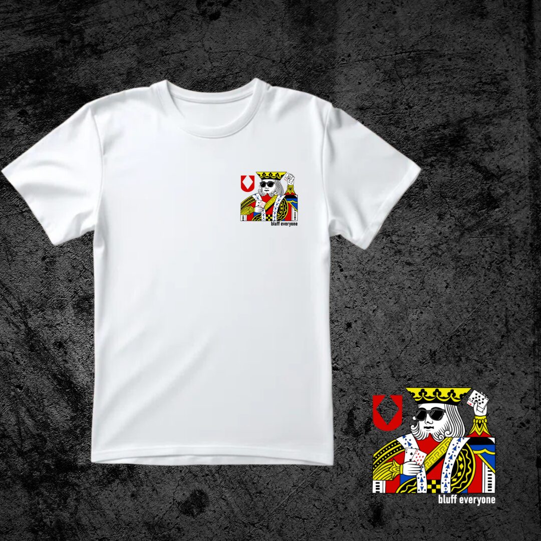 Subtle flex, royal attitude. The white King tee features a clean left-chest design of the shades-wearing king holding Chester Aces—the boldest bluff in the game. Lightweight, fresh, and built for players who wear their confidence well.